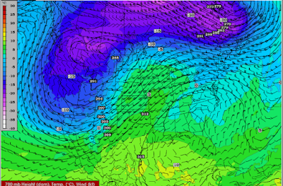 The following sequence of 700mb charts(around 10,000 feet MSL) graphically shows the cold air spreading eastward across much of the western states through the weekend.